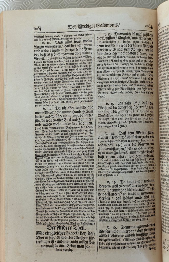Nearly every page of this small Bible book contains markings made by Bach. We may therefore assume that Bach studied this part of the Calov Bible Commentary (i.e. Luther) thoroughly and attentively. However, we must be cautious in interpreting what we see. Bach clearly reads this booklet through Luther’s lens. The markings refer to his explanations, and they are extensive (88 columns for a book of only 10 chapters, columns 1043-1130). For Luther, this book was not a ‘proto-skeptic’s manual’ (as we often read it), but it was a book full of ‘political wisdom’, written by the old and wise king Solomon. Applied politics and practical ethics. So, it’s about: