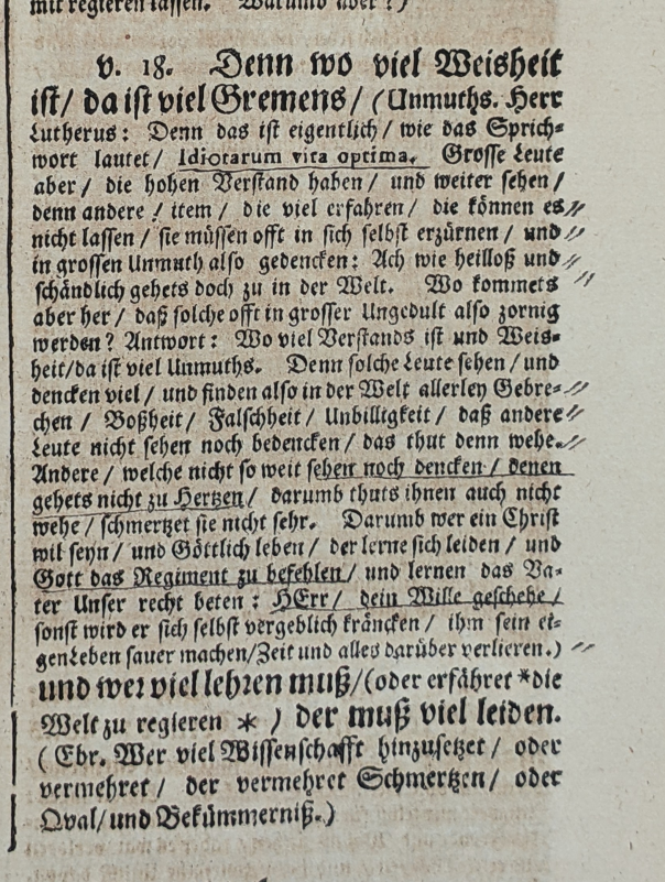 For where there is much wisdom there is much vexation (ill humor. Luther: For it is in fact just as the proverb says, Idiotarum vita optima [the life of the simple-mind is best]. People of stature who have good intelligence and who see more perceptively than others, therefore who experience much, cannot help but rage within themselves and think with much vexation: oh how wretchedly and horribly things happen in this world. How does it happen that such people grow angry with great impatience? Answer: where there is much intelligence and wisdom there is also much vexation. For such people see and reflect upon much and find in the world all sorts of infirmity, evil, falsehood, unreasonableness which other people do not see and reflect upon, and that is painful to them. Others who do not see or think so perceptively are not troubled in their hearts, suffering less and feeling little pain. Therefore whoever wants to be a Christian and lead a godly life must learn to bear his own concerns and to commend governance to God, learning to say the “Our Father”: Lord, Thy will be done. Otherwise this person will irritate himself needlessly, make his own life distasteful and waste time and other precious things.)