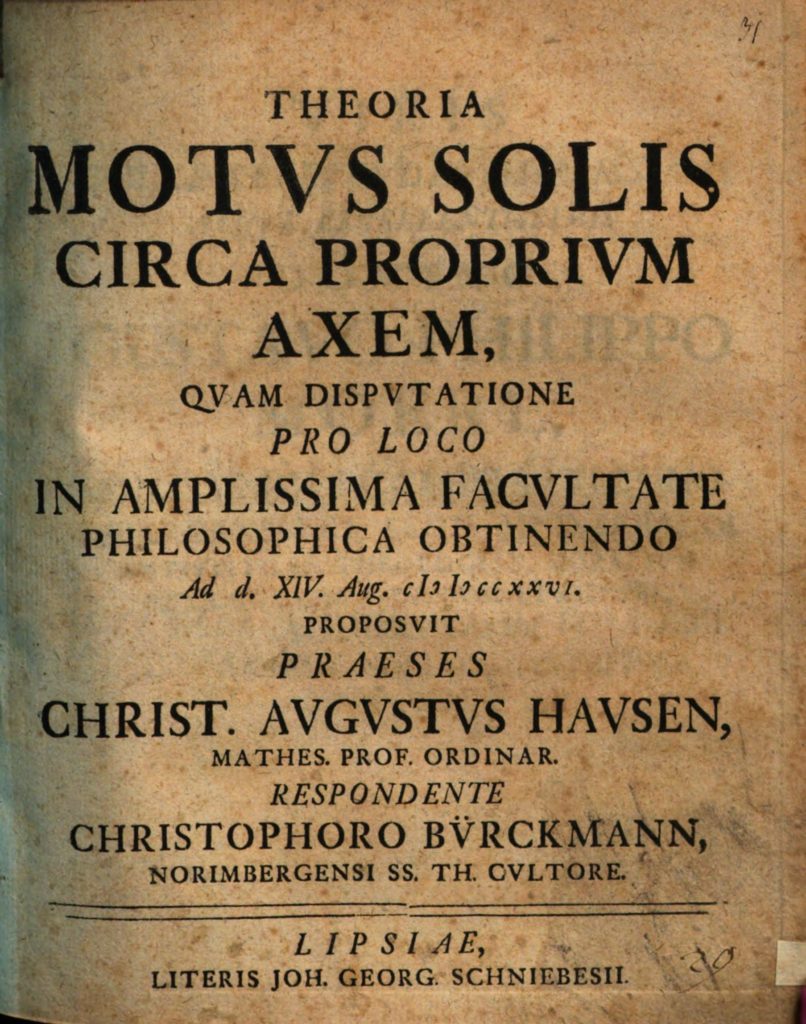 ALGEMEEN: De dissertatie bevat waarnemingen/tekeningen van de zonnevlekken po verschillende tijdstippen. Gevolgd door berekeningen (projectie van een cirkel op een bol) en een poging om precies te berekenen wat de verschuiving van de waargenomen lijnen doorheen de tijd betekent voor de hellingsgraad van de zonne-as. Die wordt op 7,25° gesteld (wat een correct resultaat is). De respondent (Birkmann) moest de stellingen en hun wiskundige bewijzen (opgesteld door de praeses: prof. Hausen) publiekelijk verdedigen voor een jury van hooggeleerde heren. Als hij daarin slaagde dan was hij ‘de materie meester’: magister. De student in kwestie is de latere predikant van Nürnberg: Christoph Birkmann (1703-1771). Deze jongeman was naast wetenschappelijk, ook muzikaal en poëtisch begaafd. Hij zong mee bij de Bach-cantates tussen 1725-1727 (studententijd te Leipzig) en leverde de teksten aan van een serie solo/dialoog cantates (eind 1726, begin 1727). Hoogstwaarschijnlijk is hij verantwoordelijk voor de revisie van de Johannespassie in 1725 . Onder de afbeeldingen (click to enlarge) een vertaling/samenvatting gemaakt door gemini.