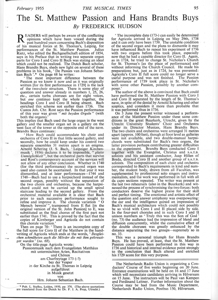 Met dank aan Eduard van Hengel, die nog bij Hans Brandt Buys heeft meegezongen. De passie vond plaats in de Buurkerk te Utrecht. En haalde zelfs The Musical Times… De toenmalige tegenwerping (je krijgt die musici nooit in die kleine galerij bij het zwaluwnestorgeltje gepropt) is nog altijd wel geldig, zelfs als Bach genoeg had aan 1 zanger per stem. Dus de hele muziekgroep van “Chor II” die in die kleine ruimte moest passen bestond uit 4 zangers, 3 violisten, 2 dwarsfluitisten, 2 hobospelers, 1 cello, 1 basinsrrument = 13 (+ organist).