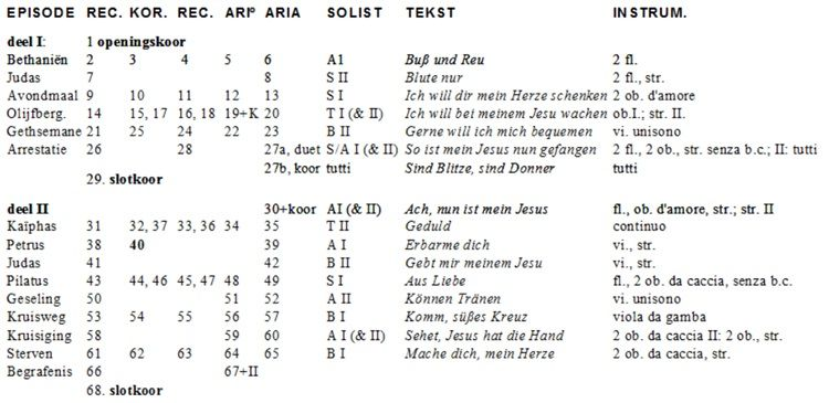 Achtergrond info (bijbels, spiritueel, muzikaal): Erbarme dich (vrouwen rond Jezus) | Openingskoor (Wie is de dochter Sion) | Am Abend da es stille war (De stilte na de kruisafname) |Sehet, Jesus hat die Hand (de kruisverheffing) | O Haupt voll Blut und Wunden (het koraal van de Passie) | Over het bloedende hart en tranen die vloeien (uit een preek van Heinrich Müller) | De tekst in het tekstboekje van Picander (1729)