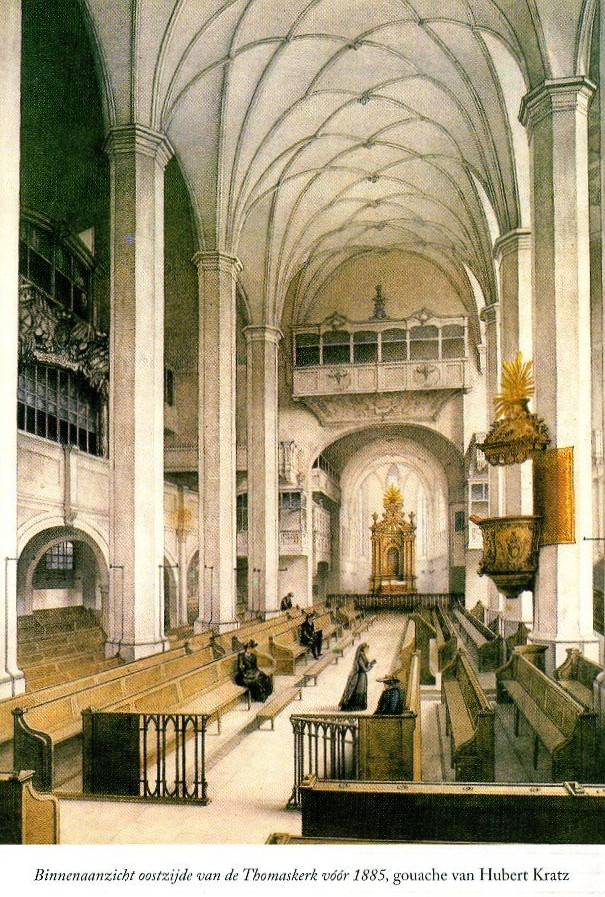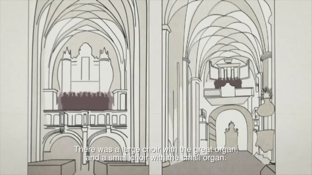De afbeelding van het doksaal in het Thomaskerk komt uit het proefschrift van Rens Bijma, uit 2017). Ze is gebaseerd op de reële afmetingen en beschikbare bronnen (brieven, nota’s, klachten, partituren (= handgeschreven stemmen, contemporaine beschrijvingen). Zij visualiseert het eindresultaat. Bach zit achter de klavecimbel. Iemand anders bespeelt het orgel als continuoinstrument (met pedaal). De 2 x 4 zangers staan bij de balustrade.