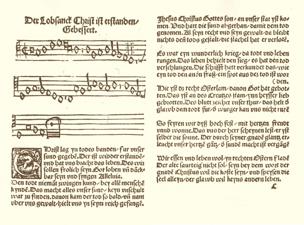 Het is duidelijk waar Luther de mosterd vandaan haalde. Hij had z’n leven lang al genoten van de Paasvieringen. Hij had als knaap al ijverig meegezongen als in de Duitse paasvieringen na de sequens Victimae paschali laudes het volk in de kerk de Hallelujas overnam door het lied Christ ist erstanden (een ‘leis’) te zingen. Als Augustijner monnik had hij vol ijver de Alleluia’s en versetten gebeden/gezongen. En zingen kon hij ! Het hoeft dan ook niet te verbazen dat op het moment dat hij de zich hervormende misliturgie wil voorzien van nieuwe Duitse liederen, dat hij voor Pasen z’n inspiratie zoekt in de Paasliturgie. Hij kende die Gregoriaanse liturgie (melodieën en teksten) van binnen en van buiten (uit het hoofd en by heart). Als hij zich aan het schrijven (en zingen) zet, dan stroomt het Paaslied van vandaag er bijna vanzelf uit: De inhoud en de zangwijze. Het is gewoon een zeer kernachtige en in krachtige taal gegoten samenvatting van de hele Paasliturgie, met als belangrijk verschil: het is niet alleen een vorm van participeren in de liturgie, maar de inhoud ervan wordt ook uitgelegd en verkondigd. In 1524 publiceert hij het lied, en in datzelfde jaar voorziet de cantor van Torgau en Wittenberg, Johann Walter, het al van een 4 stemmige polyfone zetting. Hij heeft enkel de melodie nog wat gestroomlijnd.